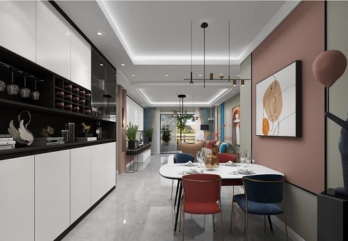 生活是一日三餐與四季,也是家人在一起的歡聲笑語(yǔ)。開放式餐廳搭配低飽和度的粉色墻面背景,將文學(xué)中的至真情愫印刻得生動(dòng)具體。