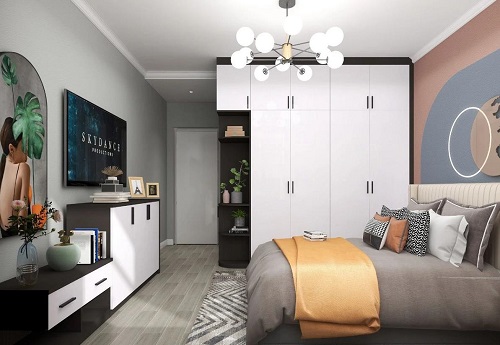 主臥采用藍(lán)灰色和粉色,搭配活力橙的床品撞色設(shè)計(jì),讓整個(gè)空間有了質(zhì)的飛躍,米白色的床頭,高級(jí)灰的被子,優(yōu)雅的掛畫,無(wú)異于讓整個(gè)空間時(shí)尚與復(fù)古并存。