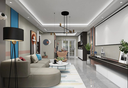 客廳的黑白灰設計,很高級,如黑夜般深邃,如星空般神秘。藍、粉跳色的搭配,讓空間增些許活力,提升空間的深度,大氣不拘,同時也很有現(xiàn)代都市的時尚感。