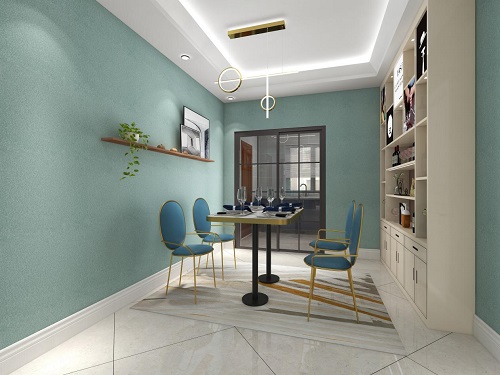 餐廳或許更能代表一個家的溫度,天然居艾草健康植物漆溫暖的湖藍(lán)色色系,總是會讓空間變得柔軟舒適。藍(lán)色的環(huán)境也使人感到幽雅寧靜,是一種令人產(chǎn)生遐想的色彩。