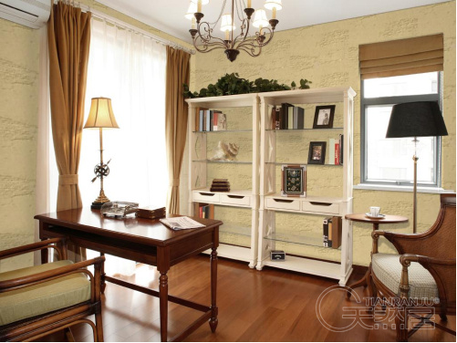 現(xiàn)代硅藻泥書房裝修,清新典雅,給人以生機(jī)盎然的感覺,這是東南亞書房給人的第一印象。帶有編織花紋的小家具襯以堪比壁紙花圖案的硅藻泥背景墻墻壁,充溢異國(guó)情調(diào)。