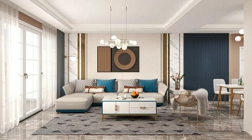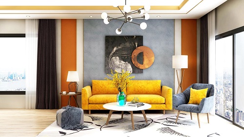 藍(lán)、橙、白三色勾勒的背景墻,很有層次感,時(shí)尚個(gè)性。一幅可以延伸室內(nèi)空間感的裝飾畫,引人遐想,同時(shí)也凸顯客廳的美感。