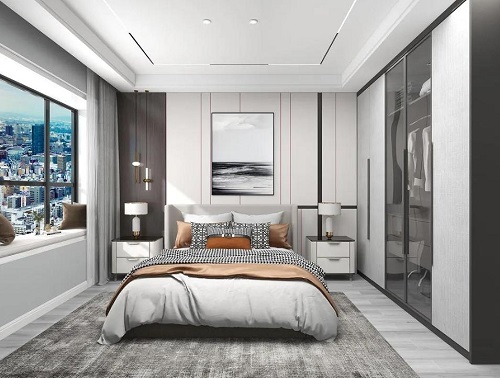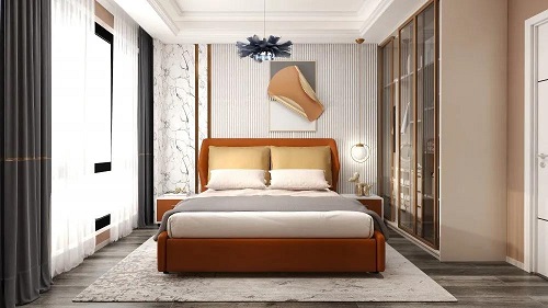 簡約的臥室設(shè)計(jì),創(chuàng)造出一個(gè)悠然自得的居家環(huán)境,再煩躁的心也能安定下來。床頭背景墻格柵,無形延伸了視覺上的空間高度。